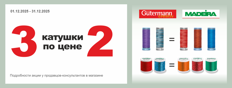 Покупая в сети магазинов «Швейный мир» две катушки ниток от лучших немецких брендов Madeira и Guetermann, третью вы получаете в подарок.